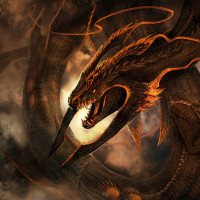 fantasy media. The dragon is characterized by intricate details and flames that seem to emanate from its mouth. In the background, there's