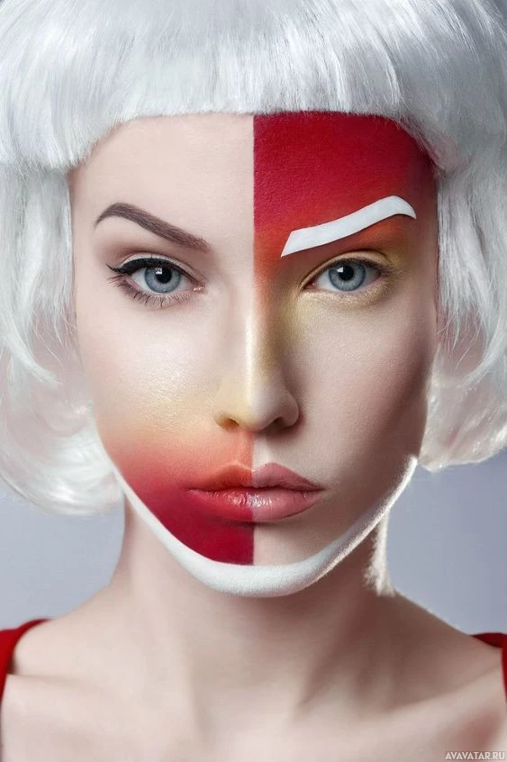 body art features various colors and patterns that create a visually striking effect on the person's face. The design appears to include