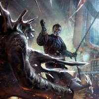 figure on the right appears to be human, holding what looks like a gun or weapon in their hands, poised for defense or attack. The background shows destruction with smoke and debris, suggesting a battlefield or war-