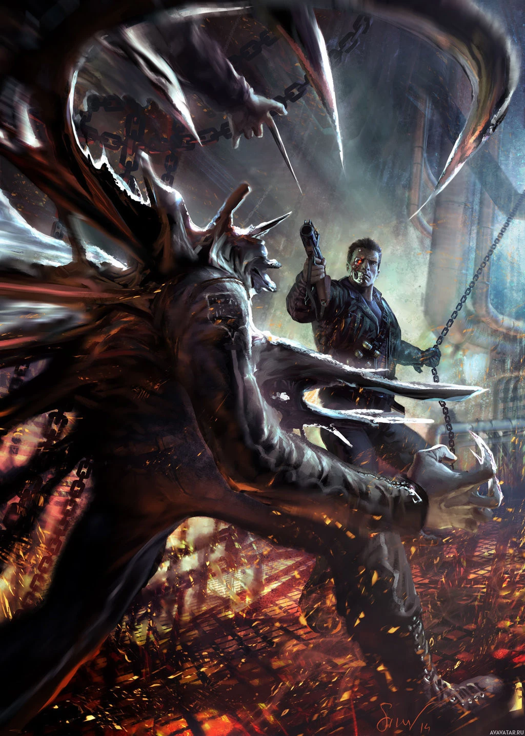 a humanoid figure with a large, menacing claw or weapon for a hand, which is characteristic of a Terminator, as well as spiky armor and a mechanical appearance suggesting it's not human. This character is pointing a pistol at another figure on the right side of the image. The