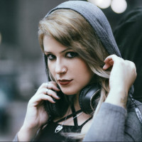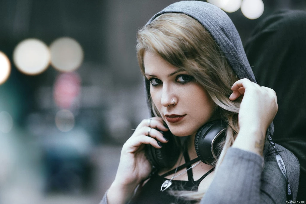 a dark hoodie with the hood pulled up over her head, and she has headphones around her neck. Her makeup includes dark lipstick, and she's looking directly at the camera with