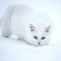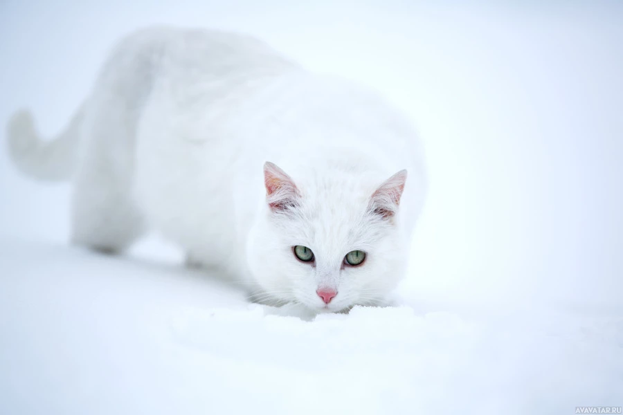 На снимке изображена белая кошка с характерными зелеными глазами в снежной среде. Кошка, кажется, идет или исследует заснеженную землю, а ее лапы частично погружены в снег.