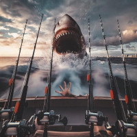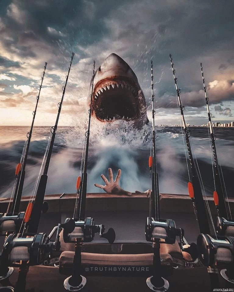 marine life. The shark's position and the rods sticking out from the back of the boat hint at a scenario where the person might be trying to catch the shark, although this is generally not advisable due to