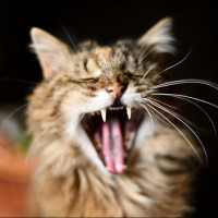 The picture shows a cat with its mouth wide open, possibly yawning or expressing a vocal sound. The cat has a striped coat and is set against a dark background that could be an interior space, suggesting it might be taken indoors.