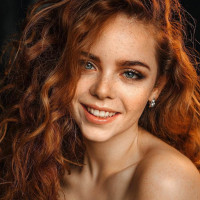 red hair. She appears to be wearing makeup that includes dark eyeshadow and possibly lipstick, giving her