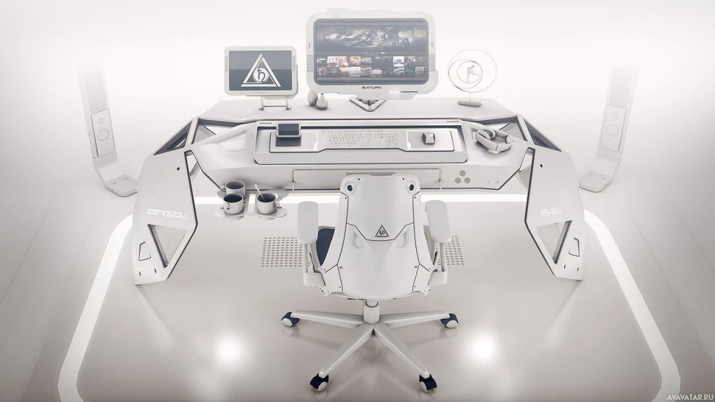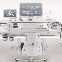 a comfortable chair in front of the desk for seating. The overall design appears to be futuristic or high-tech, suggesting that this setup could be used for tasks requiring