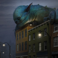 a fantasy scene with a large blue monster looming over a street of buildings. It appears to be an illustration, possibly from a book or movie, given the artistic style and quality. The monster has an amphibian-like appearance with scales and eyes that convey