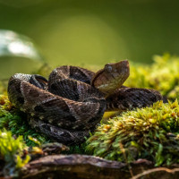 an outdoor setting, such as a forest or woodland area, given the presence of greenery and moss. The snake seems to be at ease, possibly basking in the sunlight filtering through the canopy above.