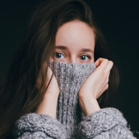 a young woman with her face partially covered, as if she is holding or wearing something over it. She appears to be wearing a soft-looking knitted sweater and has long