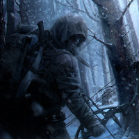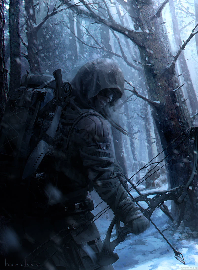 a hooded cloak and carrying a bow. It looks like a snowy forest during winter or perhaps the aftermath of