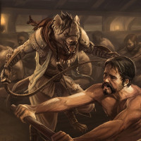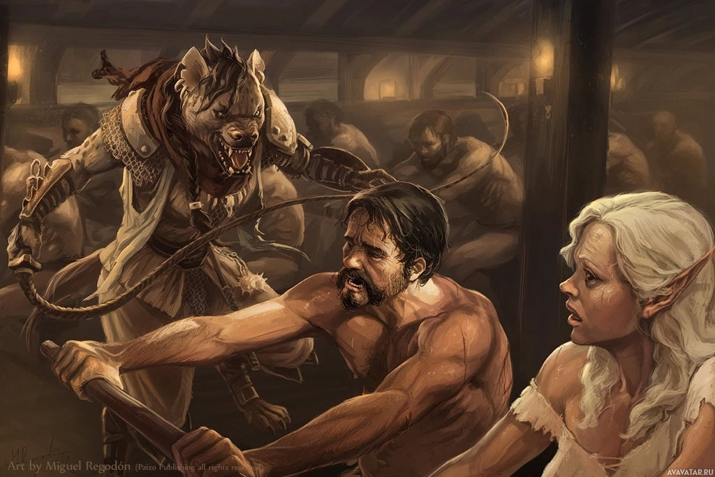 a fantasy story or game. There are several characters in the scene, including what seems to be a gnoll, which is a creature commonly found in