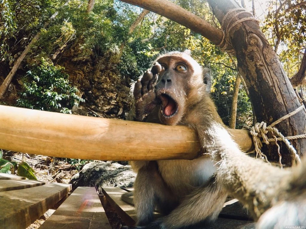 a natural setting, possibly within the dense foliage of a jungle or forest. The monkey appears to be reacting with surprise or excitement. It seems to be reaching out towards something near its face, and its mouth is open as if it's making a vocalization or expression.