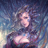a female character with a combination of human and robotic features. She has