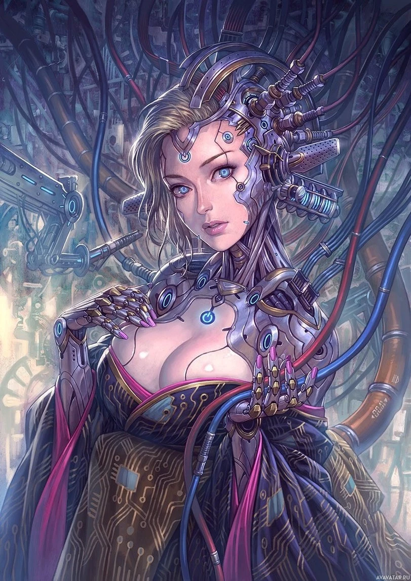 a humanoid body but her head appears to be mechanical or cybernetically augmented, suggesting she is part robot, part human. Her attire includes a garment that resembles traditional Japanese armor, which adds