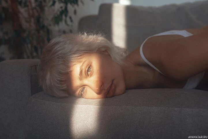 a soft glow that highlights the texture of the fabric she's resting her head on and the interplay of light and shadow on her face. The background is minimalistic with