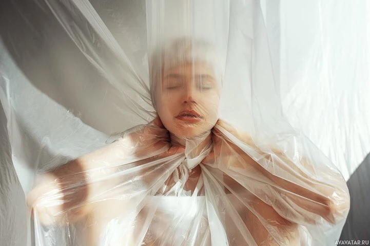 a serene environment, possibly a bathroom given the presence of what looks like a shower curtain around her.