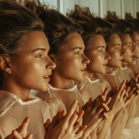 The image shows a person with multiple faces, creating an optical illusion where the viewer's perspective makes it appear as if there are several people in close proximity. This is typically achieved through digital manipulation or creative photography techniques that distort perception.