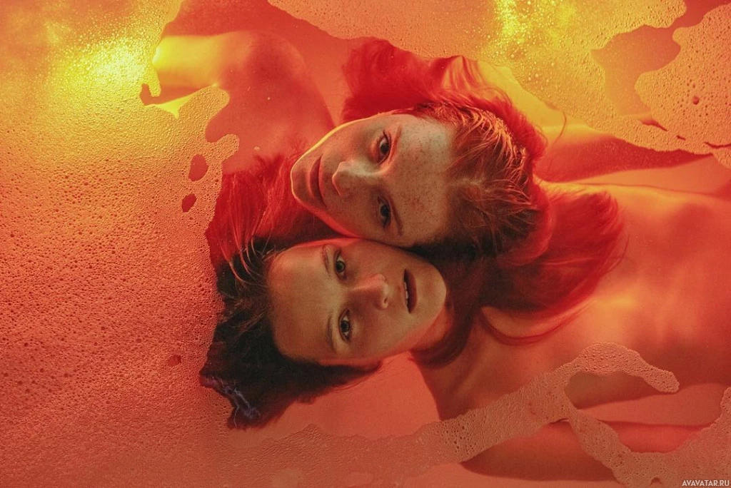red hair and appear to be looking at each other with expressions of surprise or intrigue. The water around them gives off