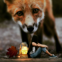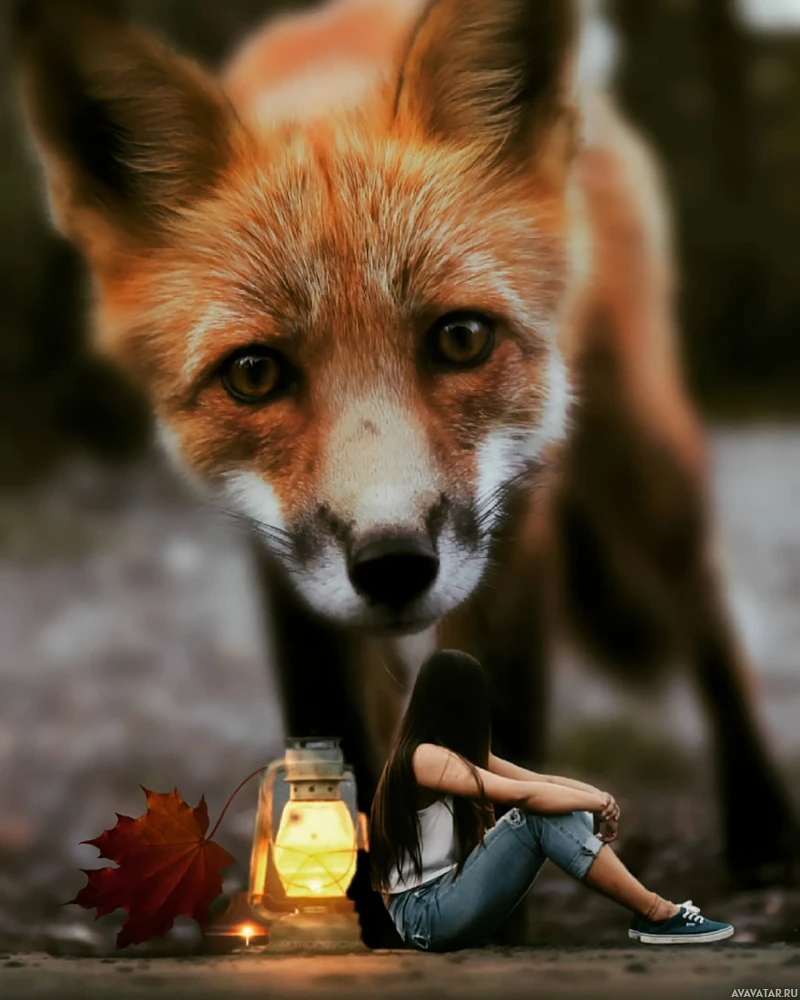 autumn leaves, possibly maple leaves, in the background. In the foreground, there is a fox looking at the camera with a somewhat surprised or intrigued expression. The setting appears to be an outdoor location during autumn season, as indicated by