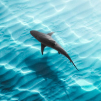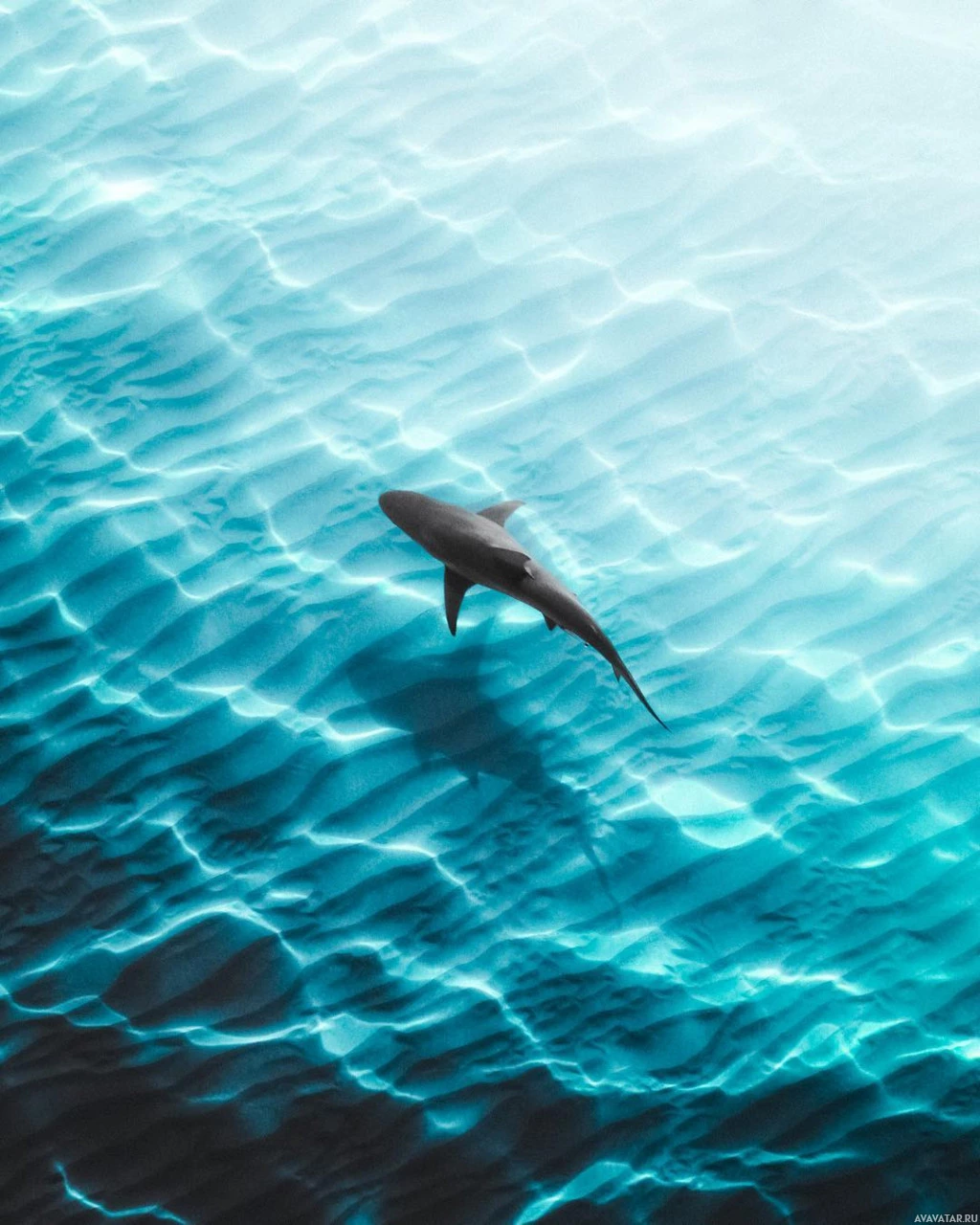 На картинке изображена акула, плавающая в океане. Рябь на воде указывает на движение воды и, возможно, на наличие течения или ветра. Светло-голубой цвет указывает на то, что это может быть мелководье вблизи береговой линии. Известно, что акулы обитают в таких местах для охоты на свою добычу.
