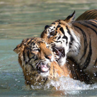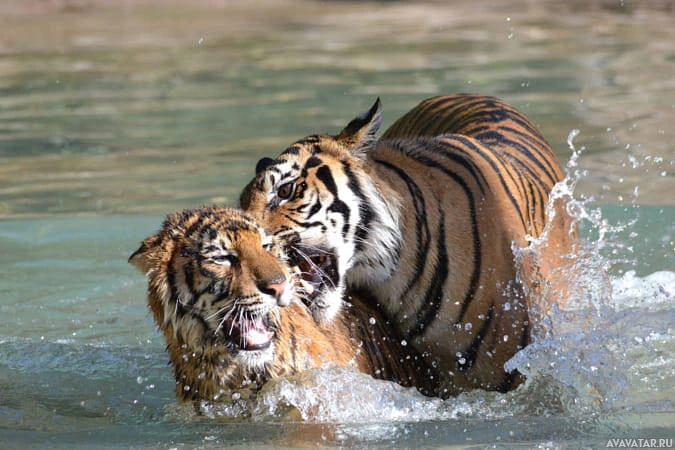 На снимке изображены два тигра в воде, один из которых кажется детенышем. Они играют или взаимодействуют друг с другом, и у большого тигра рот открыт, как будто ревет.