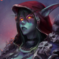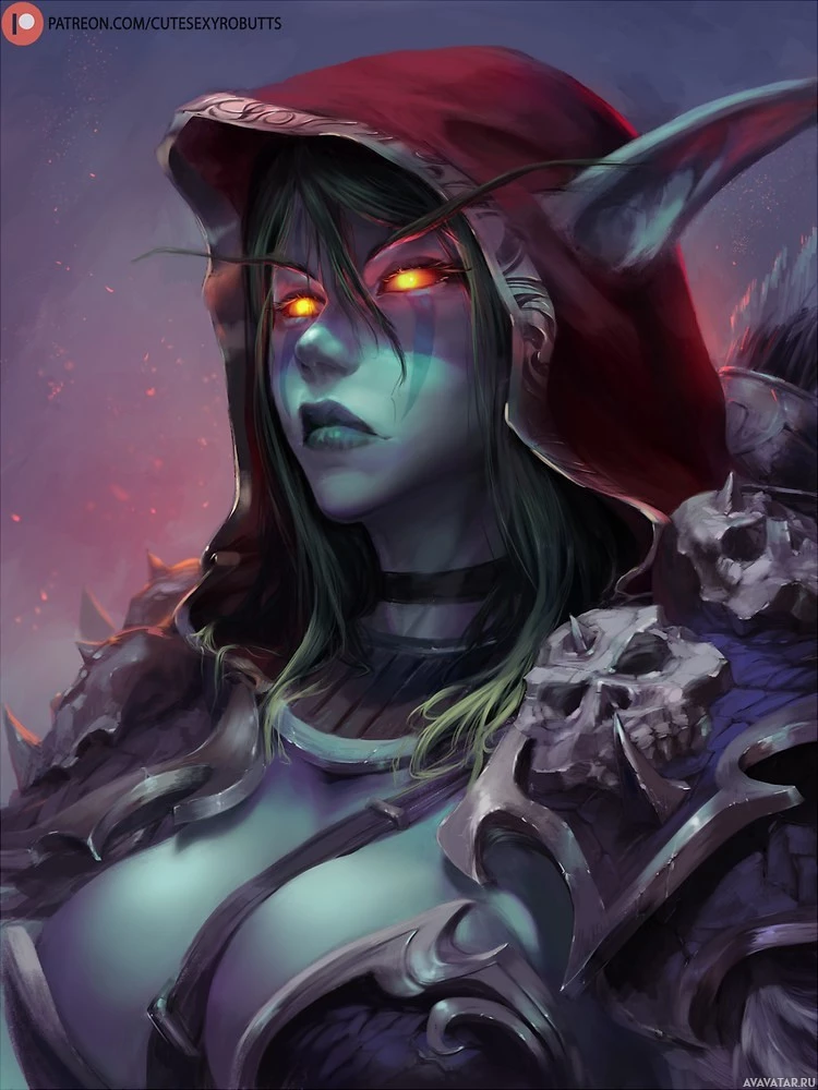 На данной картинке изображен персонаж, который выглядит как Сильванас Виндраннер из вселенной «World of Warcraft». Она изображена в красном плаще и имеет серьезное выражение на лице. Стиль работы предполагает, что это может быть произведение концепт-арта или фан-арта, вдохновленного знаниями игры.