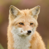 The image features a red fox (Vulpes vulpes) standing in what appears to be a grassy or shrubby area. The fox has its ears perked up and is looking off to the side, giving it an attentive appearance. This suggests that the fox might be either alert or curious about something in its environment.