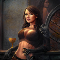 world setting, possibly a tavern or inn, as suggested by the presence of a beer mug on the table in front of her. There's also a framed portrait behind her, but she is looking directly at the viewer with