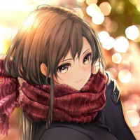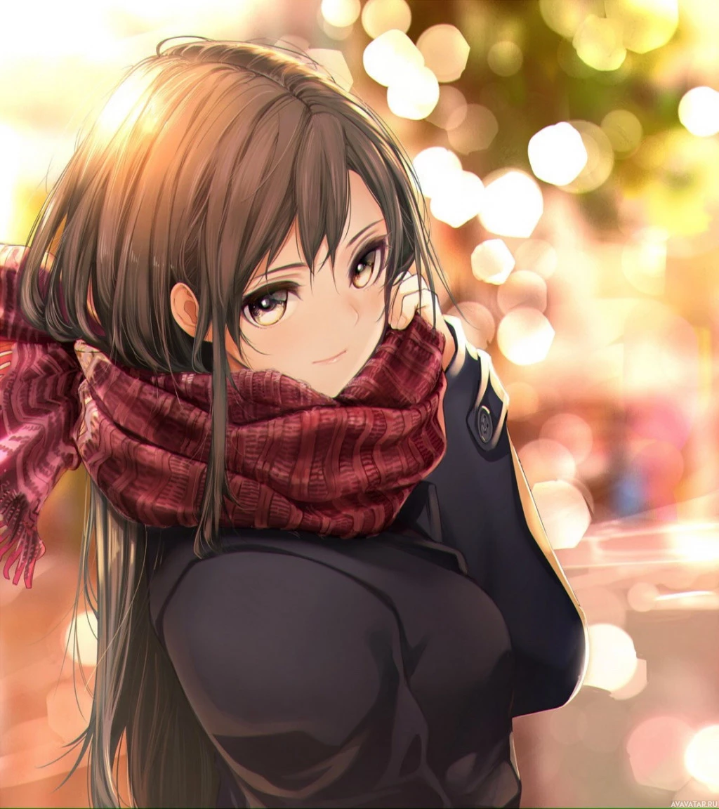 an animated character, a girl with brown hair wearing a scarf. She is smiling and appears to be in a warm-