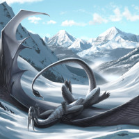 the snowy ground, with its body coiled around itself and its wings spread out wide. In the foreground, there's