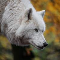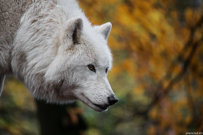 На снимке изображен волк. Он стоит на лесистой местности с деревьями с желтыми листьями, предполагая, что это может быть осень. Волк смотрит прямо в камеру с сфокусированным выражением лица.
