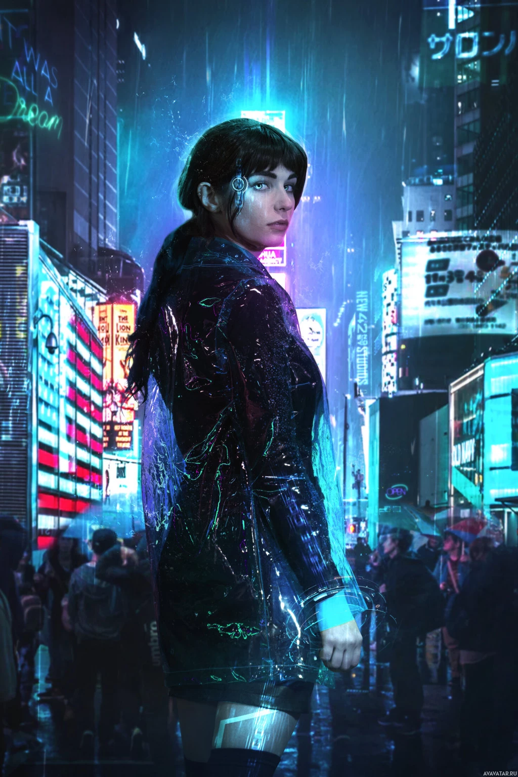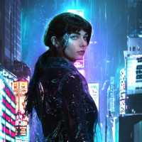 На снимке изображена женщина, стоящая под дождем на футуристической улице города ночью. У нее брюнетка и куртка с неоновыми элементами, которые могут указывать на то, что ее одежда является частью моды футуризма. Сцена яркая и атмосферная, с огнями городского пейзажа, отражающимися от влажных поверхностей вокруг нее.