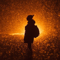 The picture shows a silhouette of a person standing alone in the middle of what appears to be rain or possibly falling snow, given the misty and dark atmosphere. The individual is wearing a backpack and seems to be looking out into the distance. There are yellowish tones that might indicate light sources in the background, creating an ethereal and mysterious ambiance.