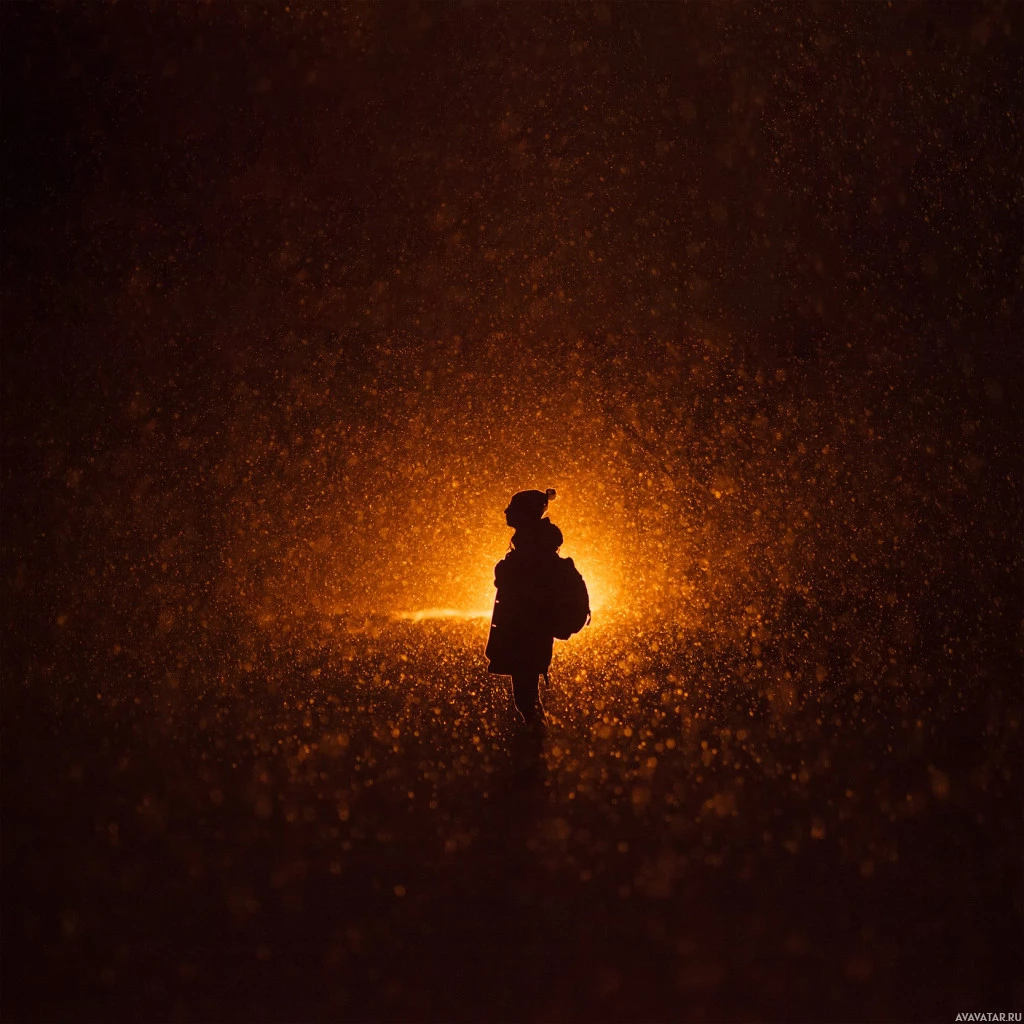 На картине изображен силуэт человека, стоящего в одиночестве посреди дождя или, возможно, падающего снега, учитывая туманную и темную атмосферу. Человек носит рюкзак и, кажется, смотрит вдаль. Есть желтоватые тона, которые могут указывать на источники света на заднем плане, создавая эфирную и таинственную атмосферу.