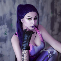 purple hair, makeup that enhances the character's dark and intense look, and attire similar to Widowmaker's outfit in the game, which includes a purple bodysuit with accents of black and pink, as well as fingerless gloves. The person is also holding what appears to be a weapon designed for the character's style, though it's not clear if it's an actual prop or just part of