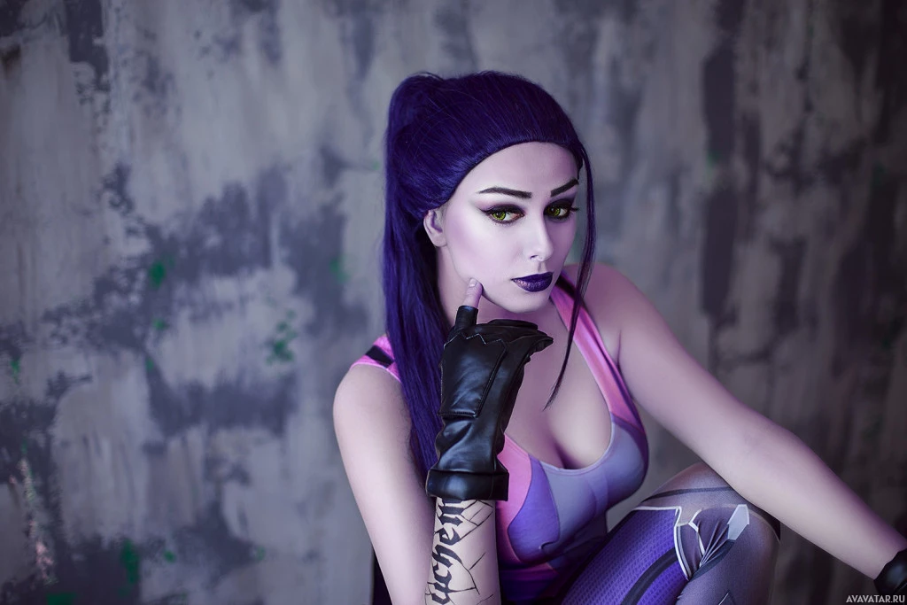 The image shows a person dressed in cosplay, portraying the character Widowmaker from