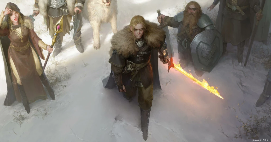 lined cloak and carrying a sword with an unlit flame on top, suggesting it might be a torch or lantern. This character is walking through what looks like a snowy landscape, surrounded by other characters that are also dressed in