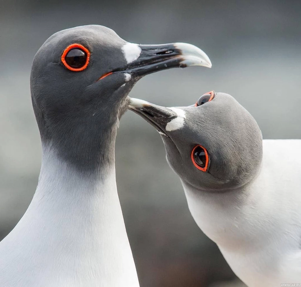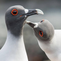 The image shows two birds, which appear to be seagulls or similar species, sitting next to each other. They are close together, with their beaks slightly open as if they're communicating or interacting. The coloration of their heads suggests that they have some