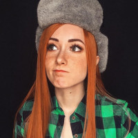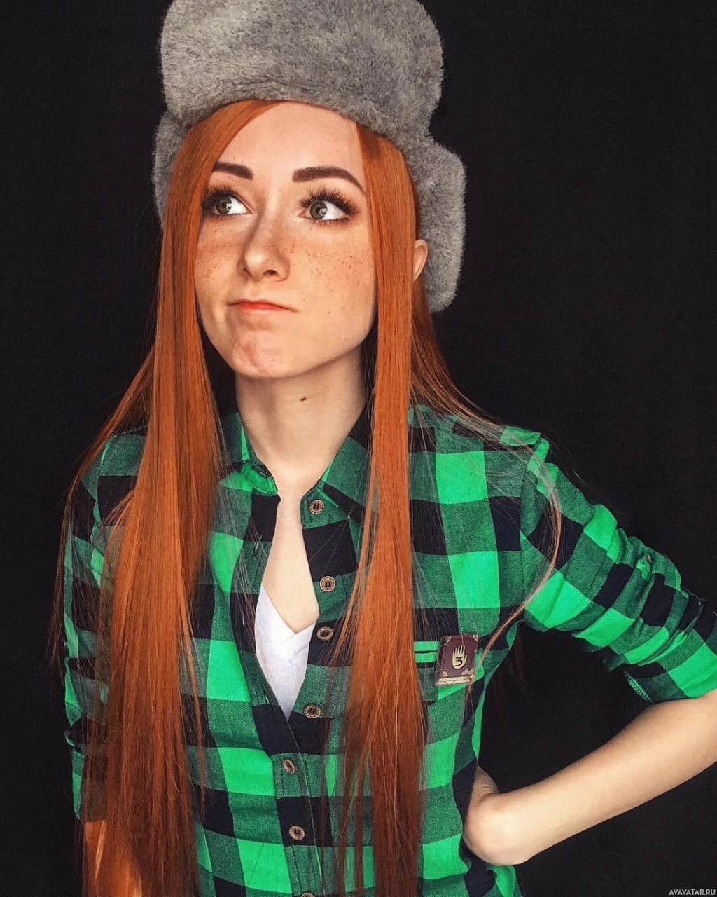The image features a person wearing a green plaid shirt, a furry hat that resembles the style from "Gravity Falls," and they have long