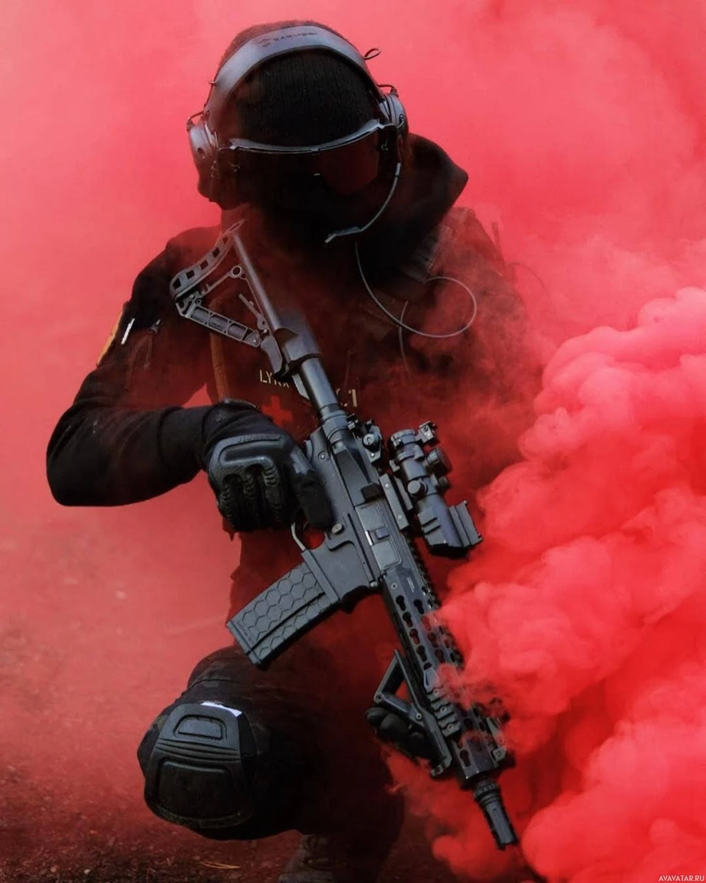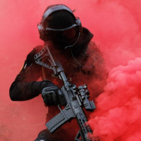 red smoke, which could be used for concealment or as part of a training exercise. The presence of this individual in military attire with a weapon implies they are likely involved in activities related to