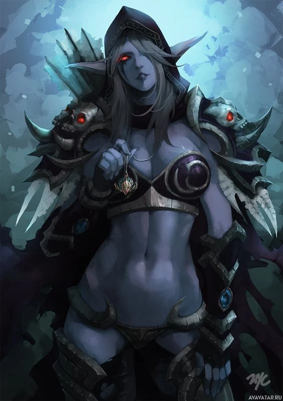 На картинке изображен женский персонаж, который, по-видимому, из фэнтезийной игры «World of Warcraft». Она носит доспехи и имеет эльфийскую или демоническую внешность, предполагая, что она может быть частью одной из фракций игры. Произведение стилизовано под темные цвета и замысловатые детали, что характерно для фан-арта в жанре фэнтези.
