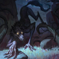 a fantasy scene featuring a werewolf. The setting appears to be a dark,
