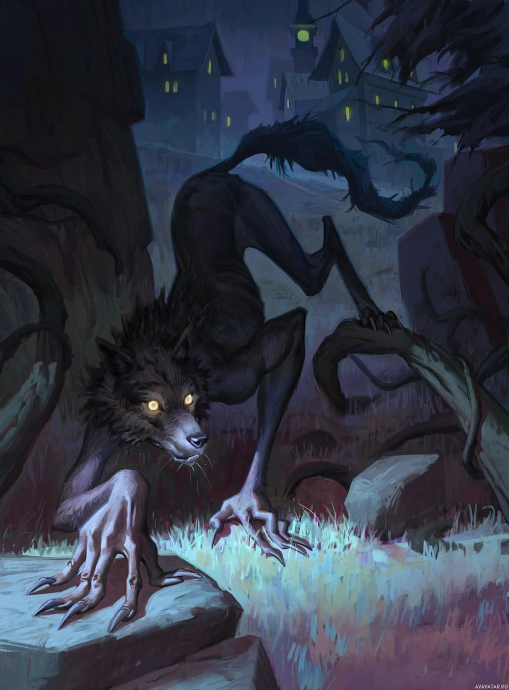 human form into its wolf-like shape. In the background, there are silhouettes of trees and what could be glimpses of houses or other structures, adding to