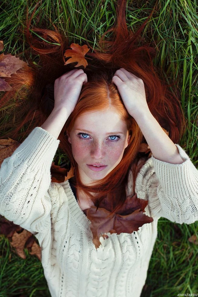 a young woman with red hair lying down in what appears to be a grassy area during autumn. She is looking upwards with her hands placed near the back of her head, perhaps feeling leaves falling around her. There are scattered leaves on the ground and around her, indicating it might be