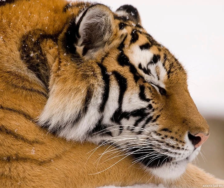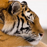 The image shows a tiger lying down with its eyes closed, appearing to be sleeping or resting. The background is snowy, indicating it might be in