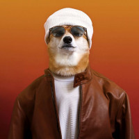 leather jacket and white sunglasses. The outfit is designed to give the impression that the dog has been anthropomorphized into a stylish human-like figure. This kind of photo manipulation or costume is often used for