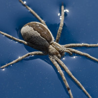 The picture shows a spider, not an animal. Spiders are known for their eight legs and the way they navigate using those limbs to travel on water's surface. This particular spider has a large abdomen and is likely adapting to the aquatic environment by moving on water.