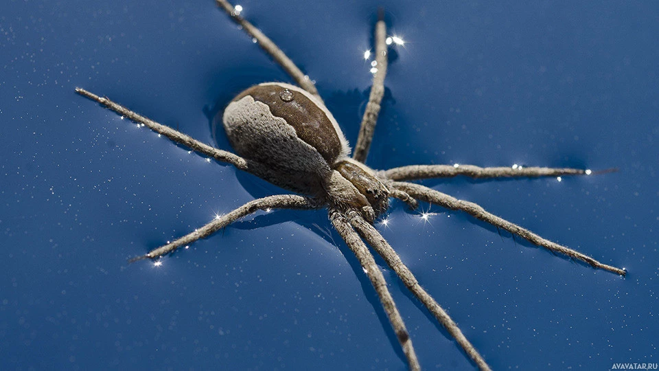 На картинке изображен паук, а не животное. Пауки известны своими восемью ногами и способом передвижения по поверхности воды с помощью этих конечностей. У этого конкретного паука большое брюшко, и, вероятно, он адаптируется к водной среде, передвигаясь по воде.