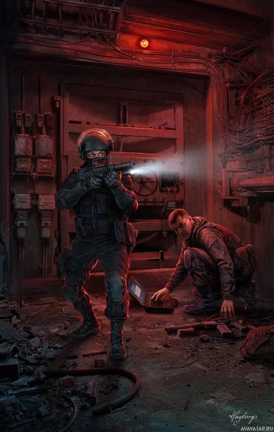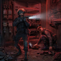 military gear or uniform. The setting appears to be an industrial or utilitarian space, possibly a workshop or