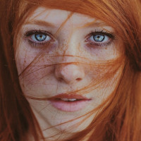facial expression is neutral, and she appears to be looking slightly away from the camera. The background is blurred, but it seems like